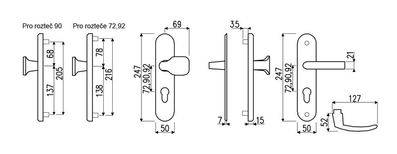 rozteč: 90 mm - tloušťka dveří: 40 - 55 mm