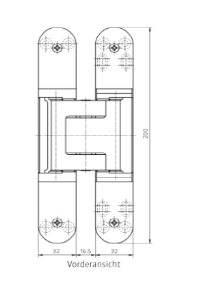Skryté dveřní závěsy pro dřevěné dveře s nosností do 120 kg (2 závěsy), úhel otevření 180°, délka 200 mm, pravolevé provedení.Barva: F1 vzhled elox.