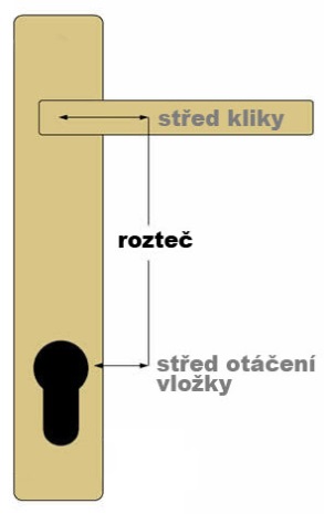 Rozteč můžeme definovat jako vzdálenost mezi středem kliky a středem otáčení vložky, což znázorňuje i první obrázek. Jinými slovy je to také rozměr, který říká, jak daleko je od sebe osa kliky a osa zámku.