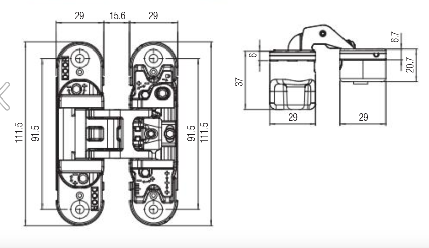 Dveřní pant je skrytý pant určený pro bezfalcové dveře minimální hloubky 30 mm. Maximální úhel otevření činí 180°.